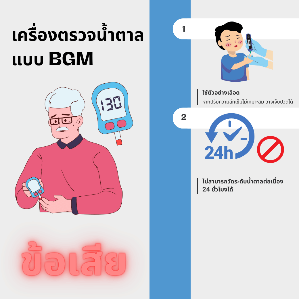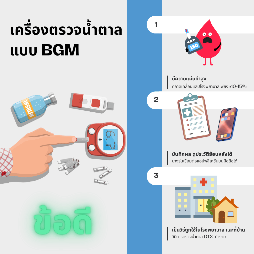 BGM (Blood Glucose Meter) คืออุปกรณ์ทางการแพทย์ที่ใช้วัดระดับน้ำตาลกลูโคสในเลือด โดยต้อง เจาะเลือดจากปลายนิ้ว ปริมาณเล็กน้อย แล้วแตะเลือดลงบนแถบตรวจ (test strip) เพื่อให้เครื่องแสดงค่าระดับน้ำตาลออกมา