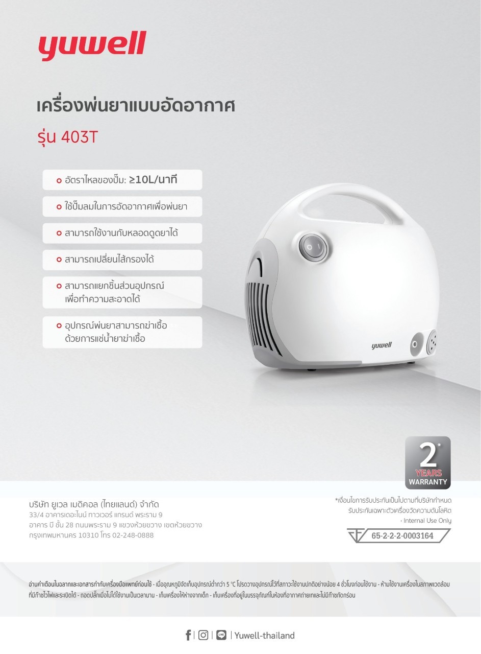 ใช้สำหรับพ่นละอองยาเพื่อรักษาผู้ป่วยโรคทางเดินหายใจ เช่น โรคหอบหืด และโรคหลอดลมอักเสบเรื้อรัง สามารถพกพาได้สะดวก รุ่น Yuwell 403T เป็นคอมเพรสเซอร์แบบใหม่ ที่มาพร้อมเทคโนโลยีการอัดอากาศกรองละอองยาได้ละเอียด ซึมเข้าสู่ทางเดินหายใจได้ดี